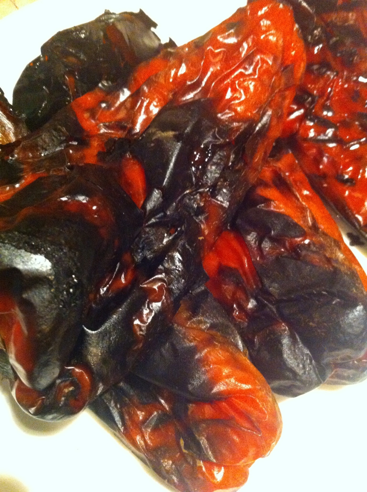 – roast the red peppers on high heat on an outdoor BBQ until black and charred. let sit to cool on a plate or a sealed paper bag – about 10 minutes.